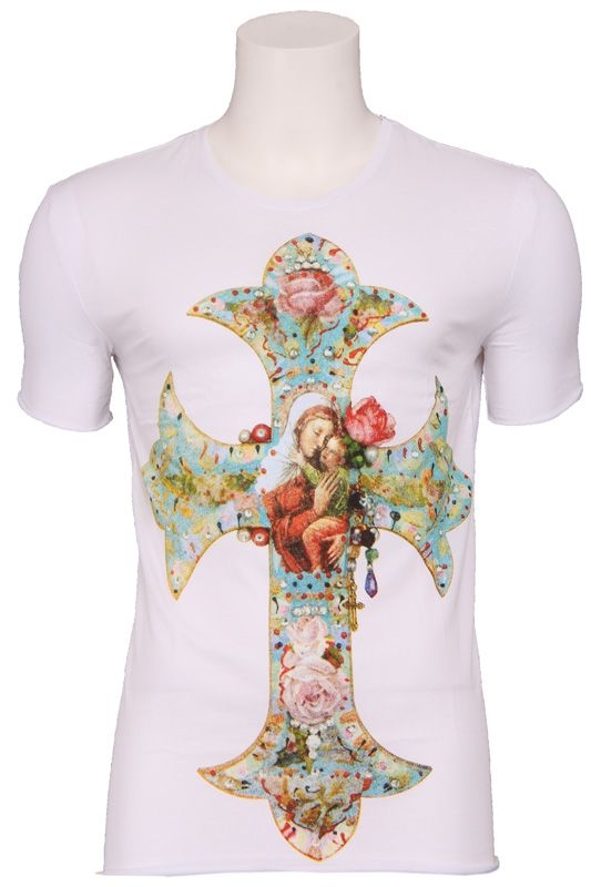 Wit t-shirt met ronde hals van Antony Morato. Op de voorkant staat een groot kruis met Maria en Jezus middenin, in mooie felle kleuren voor een opvallende look!