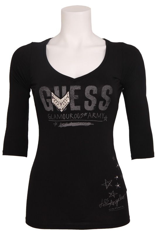 Mooi aansluitend shirt van Guess met 3/4 mouw en v-hals. Op de voorkant staat het logo van Guess met een zilveren stuk met witte parels.