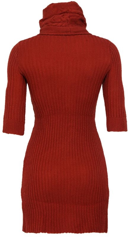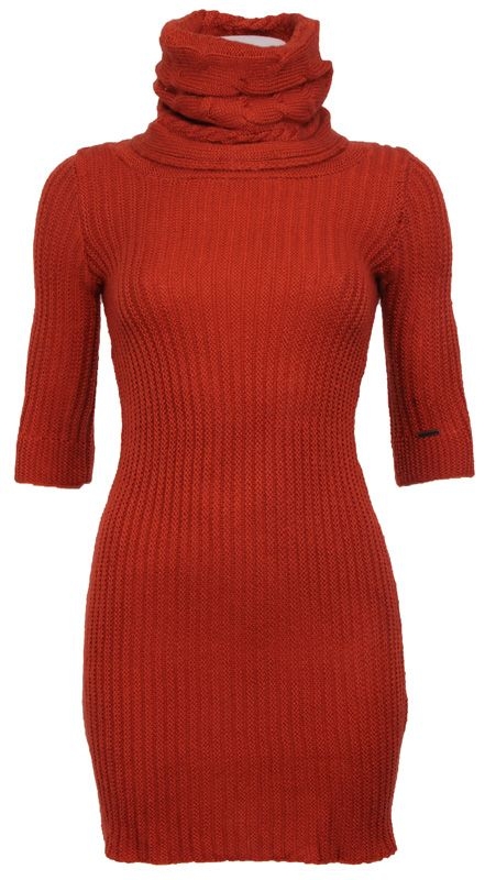 Oranje jurk van Amy Gee in winterkwaliteit en 3/4 mouwen. De trui is gebreid met oranje garen. De coltrui heeft een ander brei motief voor een speels effect.
