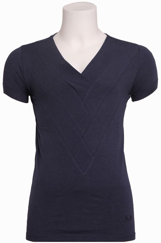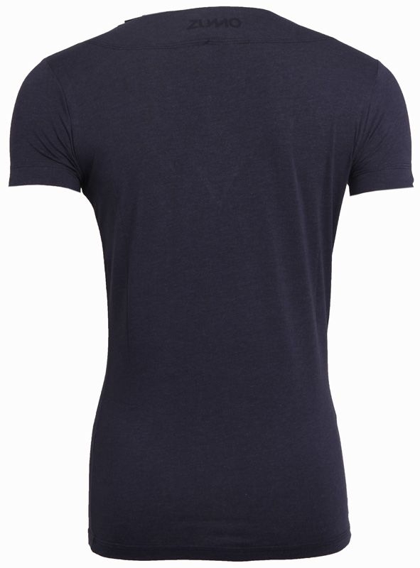 Donkerblauw shirt van Zumo met een v-hals die doorloopt naar beneden waardoor je een leuk effect krijgt. LET OP: Zumo valt een maat kleiner dan normaal.