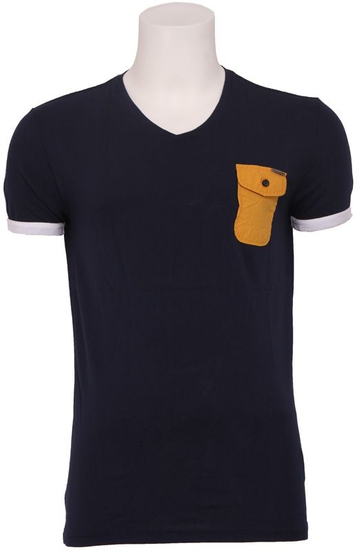 T-shirt van Antony Morato met hoge v-hals. Donkerblauwe kleur maar leuke accenten door het gele borstzakje en de witte mouwen.