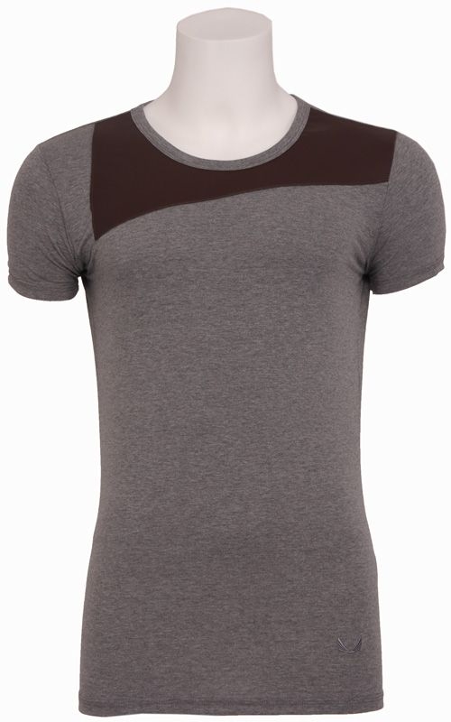 Grijs shirt van Zumo met hele mooie bruine 'leren' hals. Strak model.