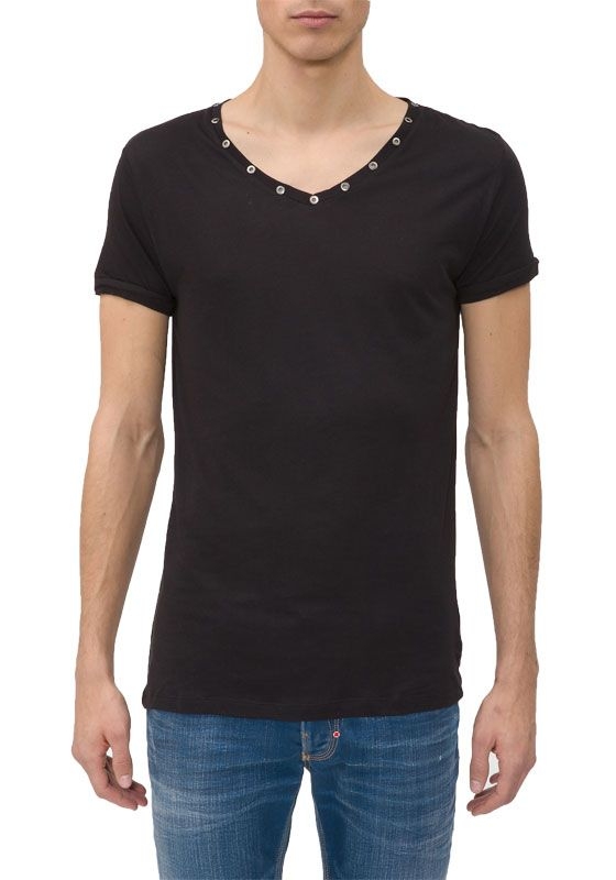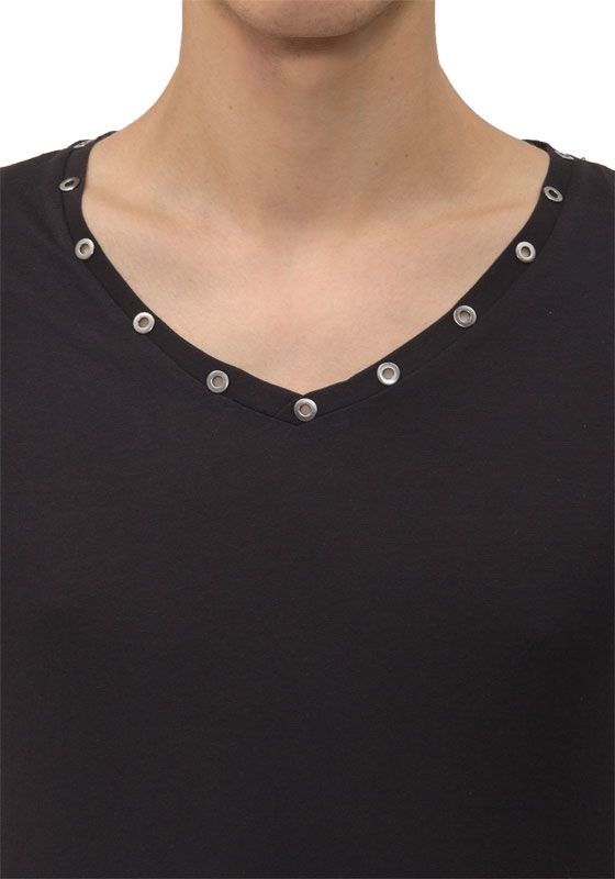 Zwart shirt van Antony Morato met ronde hals. Het is een effen shirt maar voorzien van ringetjes in de hals. Normale pasvorm en lengte.