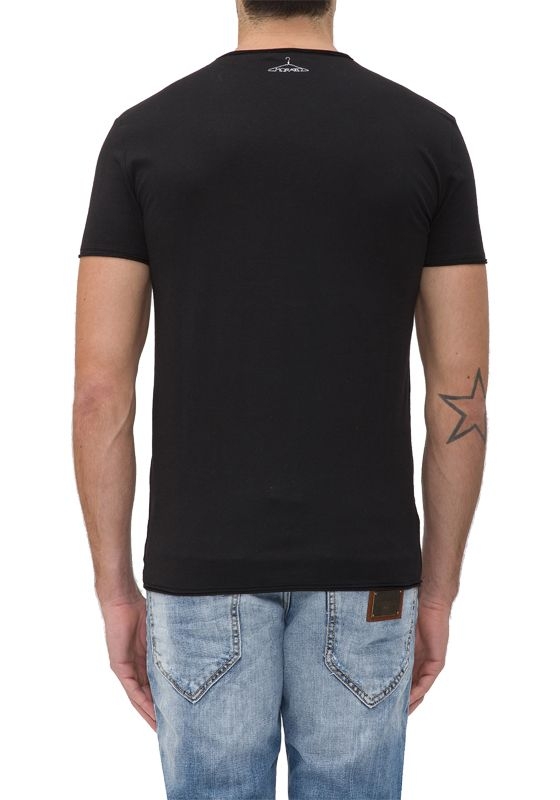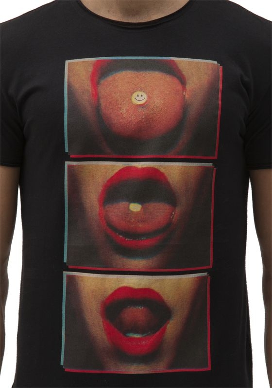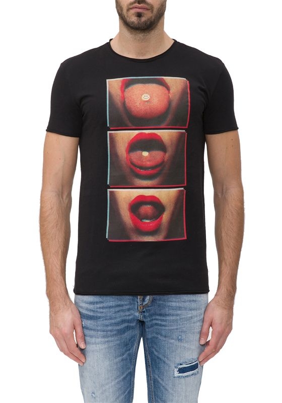 Zwart t-shirt van Antony Morato met ronde hals. Helemaal in het zwart maar wel een opvallend rood kleurig plaatje van een mond op de voorkant.