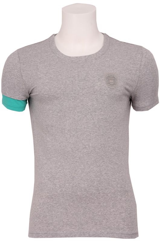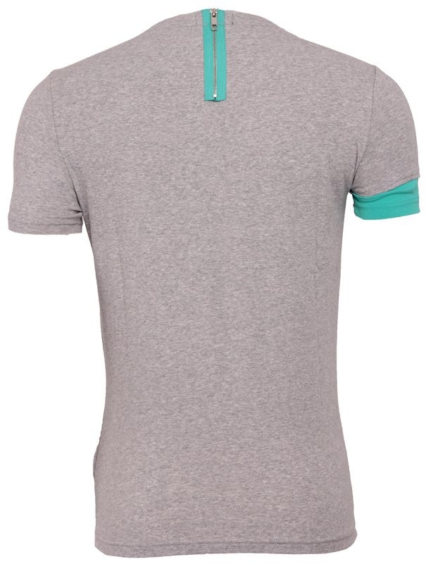 Grijs shirt van Antony Morato met ronde hals. Op de linkerborst voorzien van een Antony Morato logo. Leuk speels effect door de turquiose mouw aan de rechtarm en het turquoise ritje op de achterkant bij de hals.