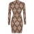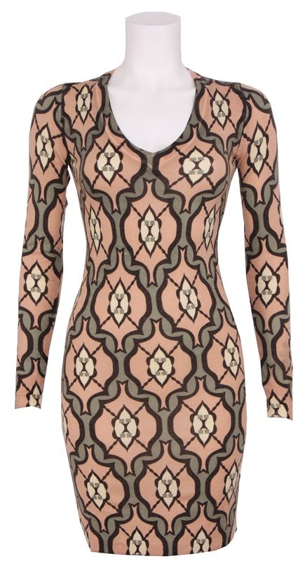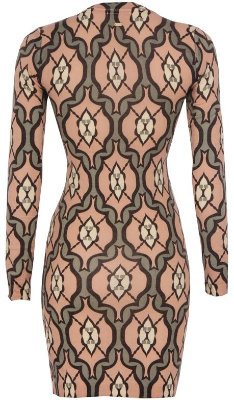 Zalmroze jurk van Phard met een speciaal patroon. Deze jurk heeft een v-hals en is halflang.