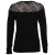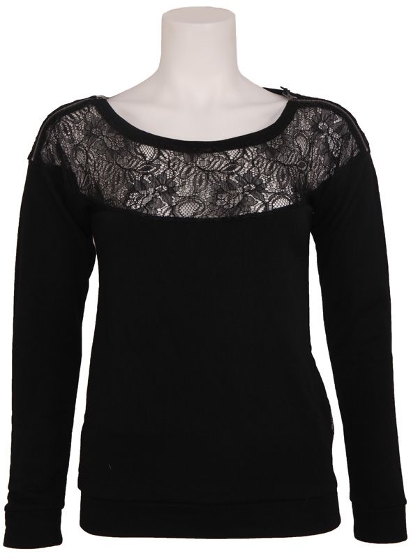 Zwarte trui van Guess met bij de hals een kanten accent. Hierdoor krijgt de trui zijn speciale look. Lengte is normaal en pasvorm ook.