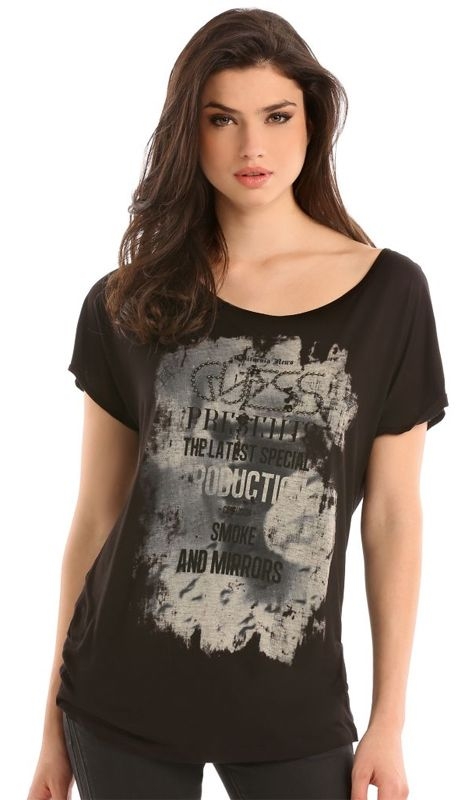 Losjes zwart logo shirt van het populaire merk Guess, heerlijk stofje voor de warme zomerdagen. Op de voorkant staat met zilveren studs Guess geschreven, en op de achterkant heeft het shirt een leuke ronde opening.