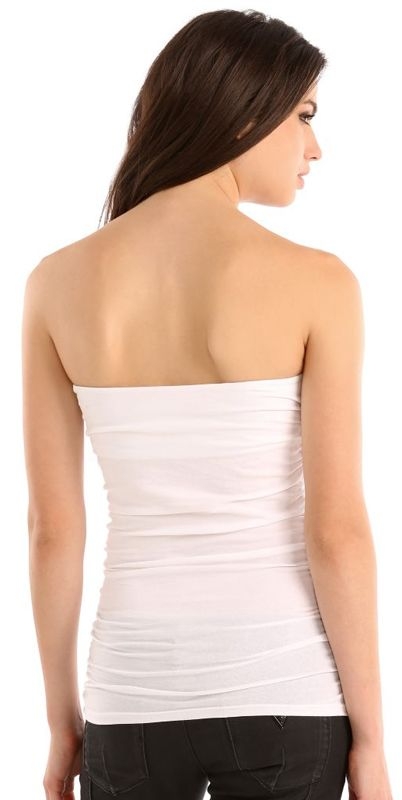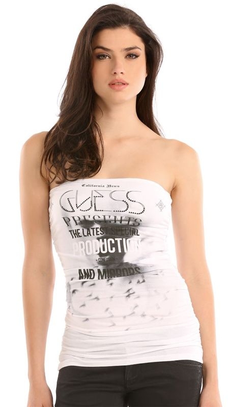 Strapless top van het populaire merk Guess in de kleur wit. Mooi aansluitend model met op de voorkant een mooi logo van Guess. De letters zijn bewerkt met zwarte steentjes. Leuk voor de zomerdagen of voor het stappen.