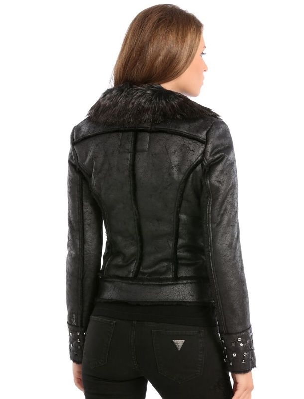Leather look jas van Guess van Polyester. De jas heeft een vintage uiterlijk en is voorzien van stoere ritsjes. De uiteinden van de mouwen zijn voorzien van studs en de hals is voorzien van een 'bontkraag'. Kort model.