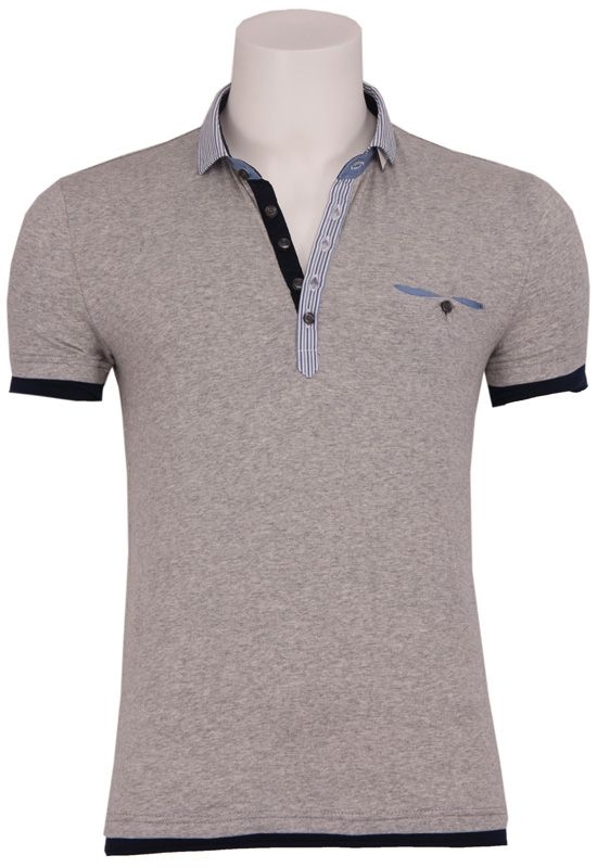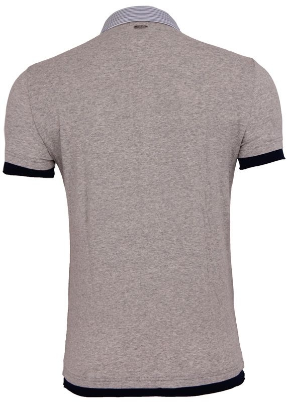 Grijze polo van Antony Morato met een kraag in smalle streep motief. Het streepmotief is uitgevoerd in de kleuren donderblauw, wit en lichtblauw en heeft hierdoor een mooi contrast met de grijze kleur van de rest van het shirt. De borst is voorzien van een subtiel zakje met een blauwe voering. Onderkant is voorzien van een donkerblauwe omslag.