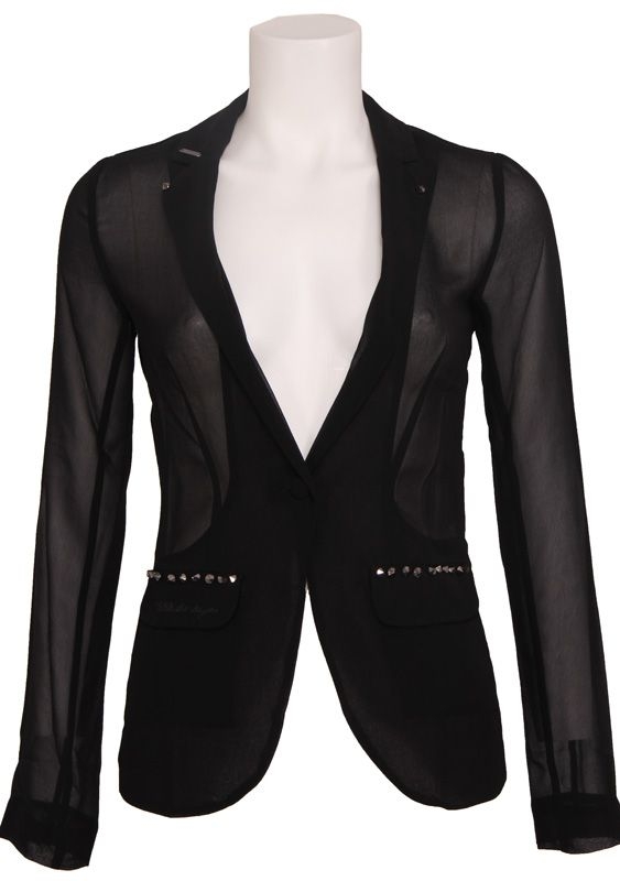 Doorzichtig zwart colbert jasje van het populaire merk Guess. Het jasje heeft op de voorkant zakken met mooie pailletten en het Guess merk. Op de schouders (achterkant) heeft het jasje een mooi kanten afwerking.
