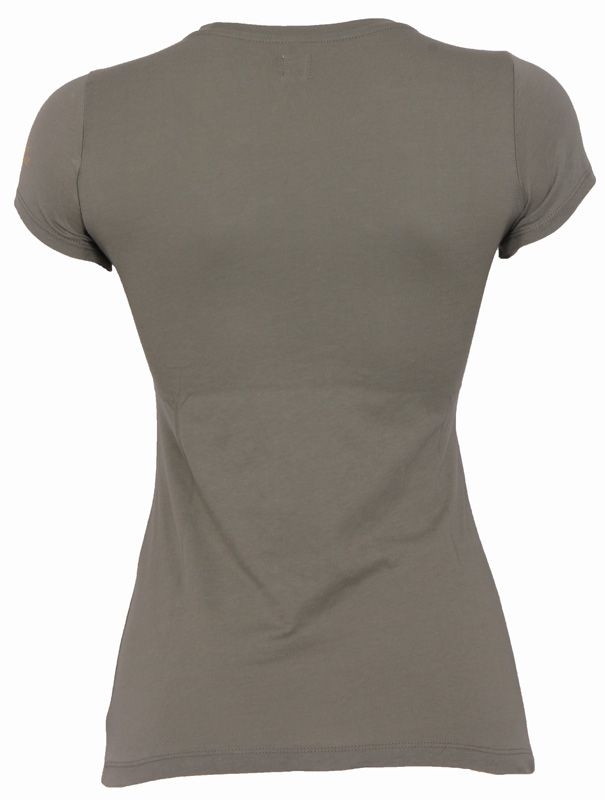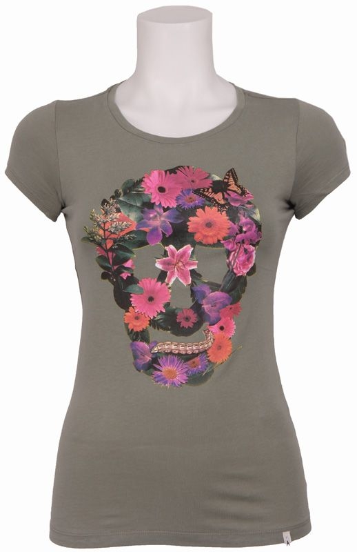Leger groen t-shirt van Amy Gee, met als print bloemen in de vorm van een doodskop. Hartstikke leuk voor op een spijkerbroek!