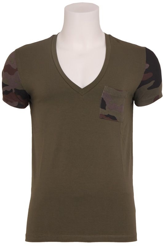 Mooi V-hals shirt in legergroen van Zumo. De mouwen hebben een camouflage print en een zakje op de voorkant heeft dezelfde print.