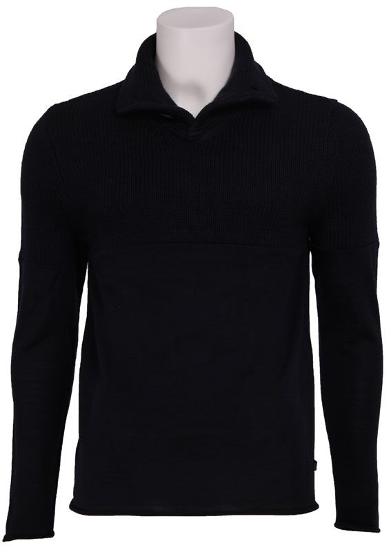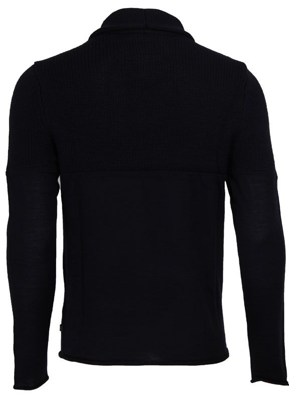 Donkerblauwe trui van Guess. Door de twee verschillende afwerkingsniveau's in deze trui krijgt deze een aparte uitstraling. De kleur is multifunctioneel en met alles te combineren.