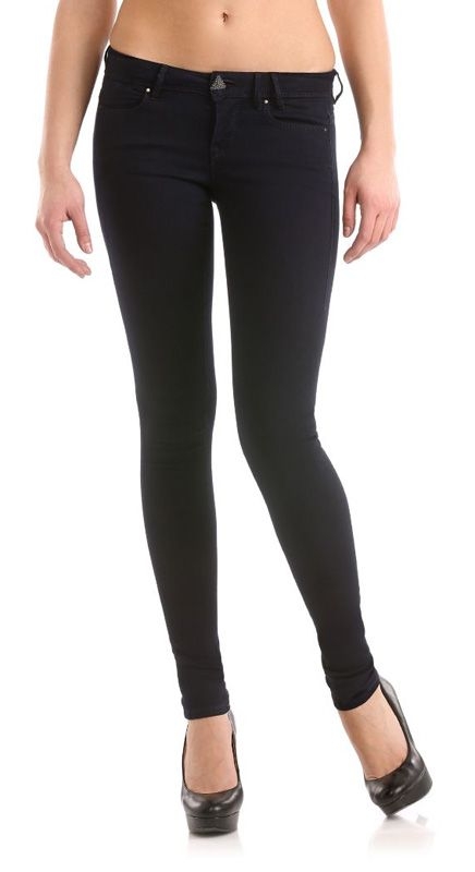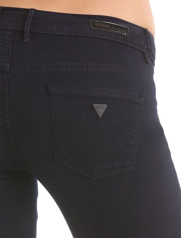 Donkerblauwe jegging van Guess. Voorzien van een opvallende knoop op de voorkant. De achterkant is afgewerkt met twee zakken op de achterkant.