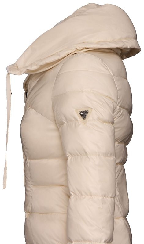 Korte jack van het mooie kledingmerk Guess in een crème kleur. De jas is mooi getailleerd en voorzien van twee zakken met rits aan de voorkant. De jack is hoog waardoor deze jas extra warmte biedt en er ook nog een super leuk uitziet. Op de linkerkant zit een mooi pailletten teken en de rits is tevens voorzien van een Guess logo.