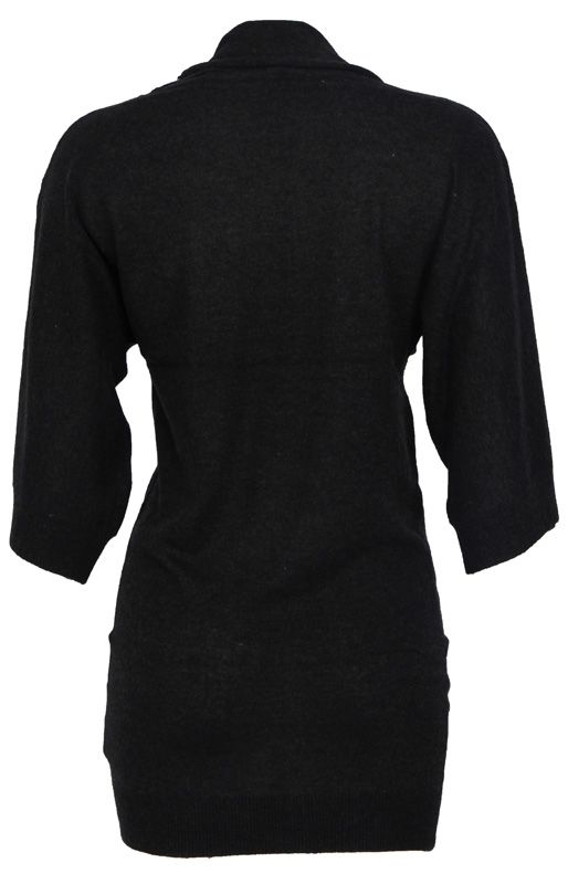 Lange trui van Amy Gee in het antraciet met een groene schijn. Strak bij de heupen en voor de rest wat losser. Met dieper hangende col en grote mouwen.
