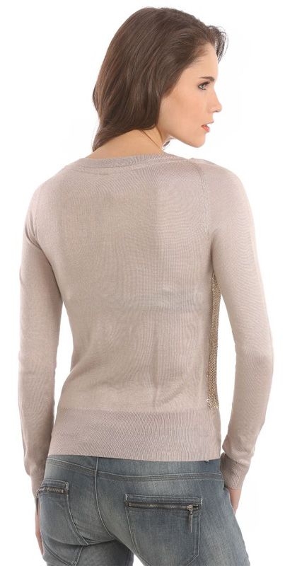 Beige / taupe trui van Guess met op de voorkant gouden pailletten. Helemaal hot in het huidige modebeeld! Steel jij de show deze winter?