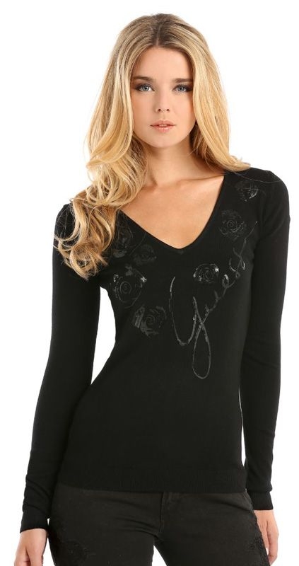 Zwarte longsleeve van Guess met diepe v-hals. Erg mooi aansluitend model. De hals is afgewerkt met een mooi Guess logo.