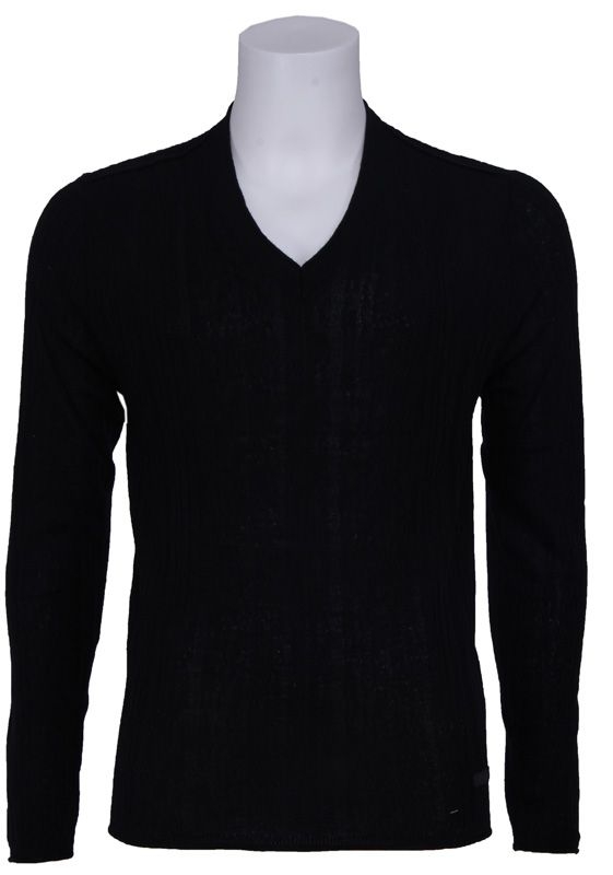 Zwarte trui van Guess met v-hals. De trui heeft een soort van hele subtiele 'kabelstructuur' voor een winters uiterlijk.