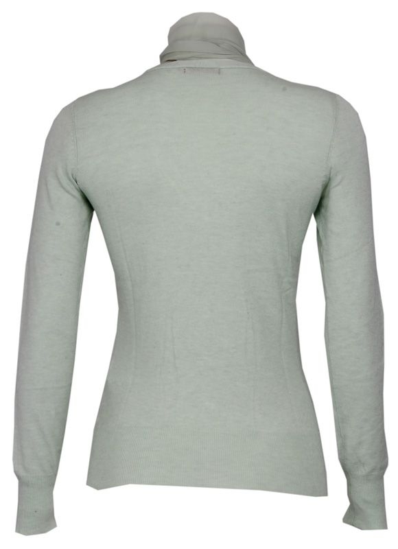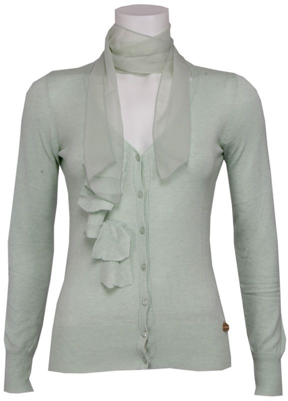 Mintgroen vest van Phard met decoratieve franjels aan de voorzijde langs de sluiting met knopen. Als extra blikvanger heeft dit vest een 'zijde' sjaal.