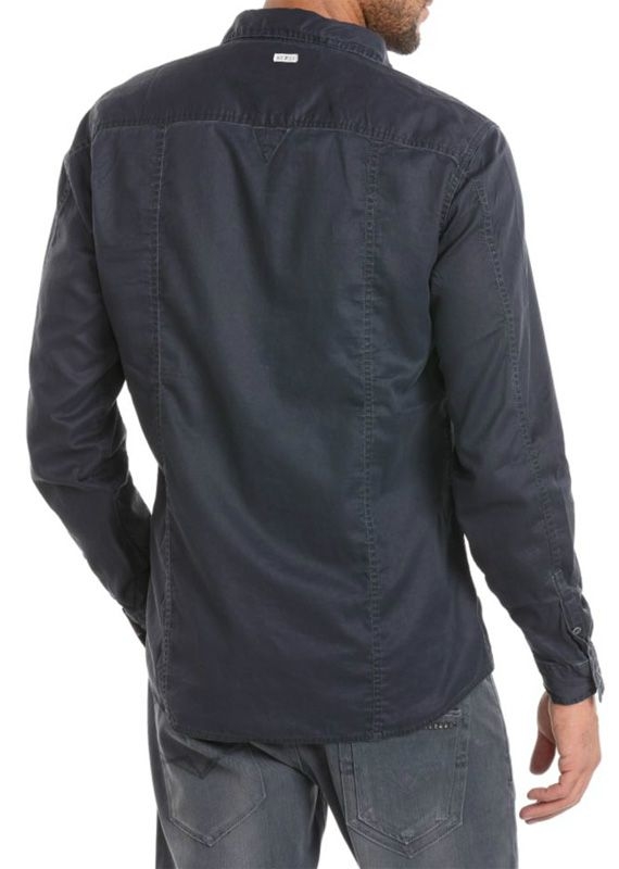 Donkerblauwe blouse van Guess: LS Manny Shirt met normale kraag. Coated-look overhemd met lange mouwen. Mooi detail is het Guess logo achterin de kraag.