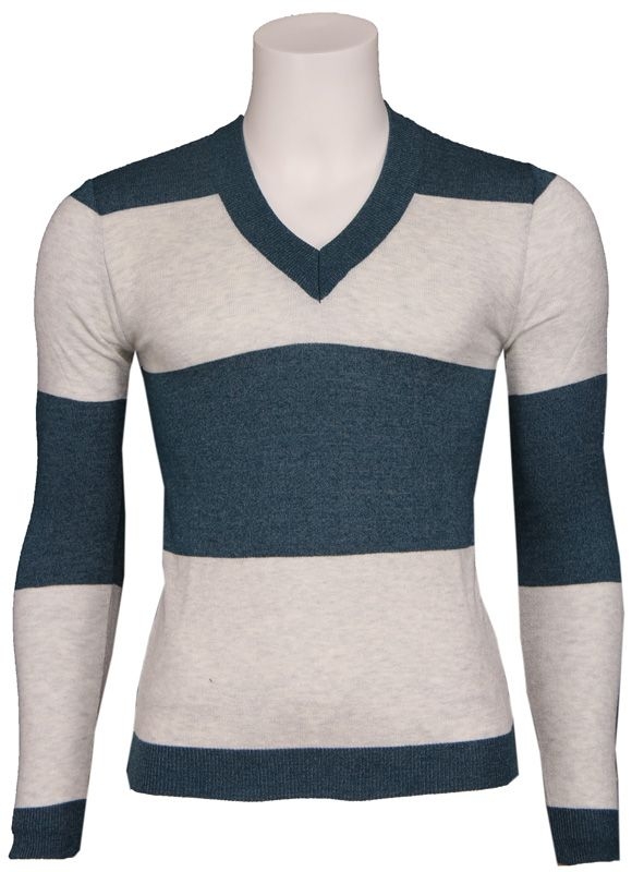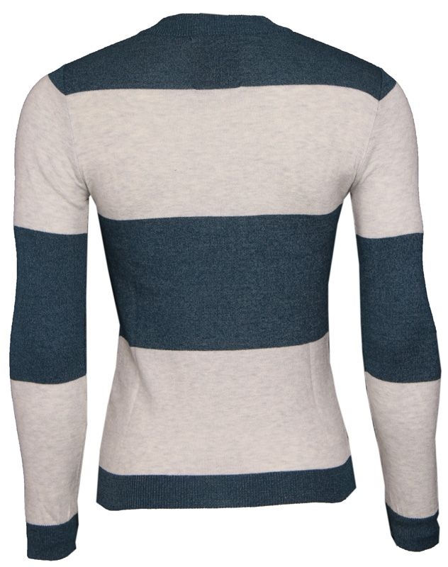 Blauw met beige gestreepte V-neck trui van Zumo. Het is een mooi aansluitend model. LET OP: Zumo valt klein, bestel een maatje groter.