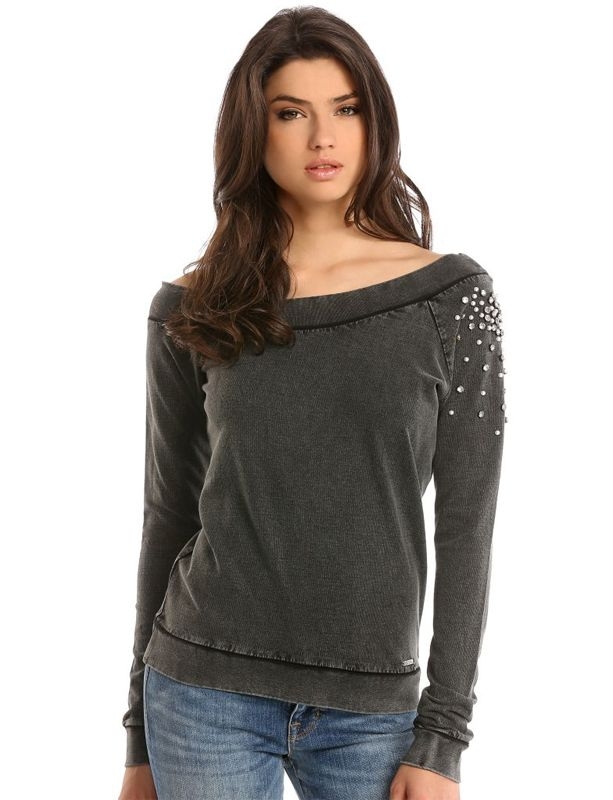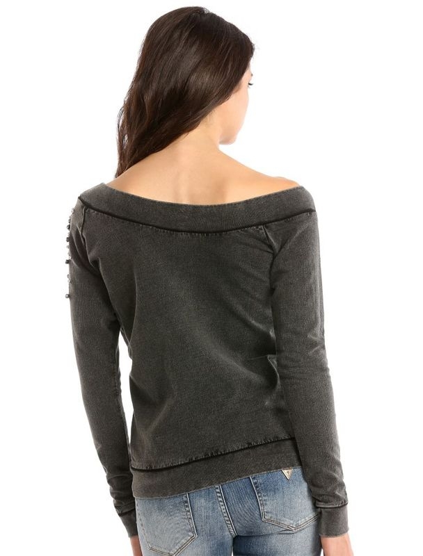 Vintage one shoulder trui van Guess in de kleur zwart. De trui is voorzien van studs op de linker schouder. Trui sluit mooi aan. Let op met wassen in verband met de studs. Lengte is normaal.