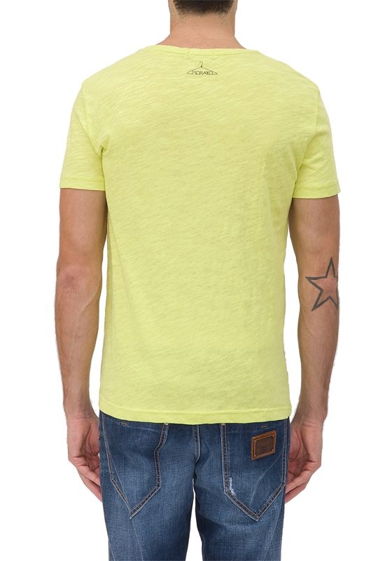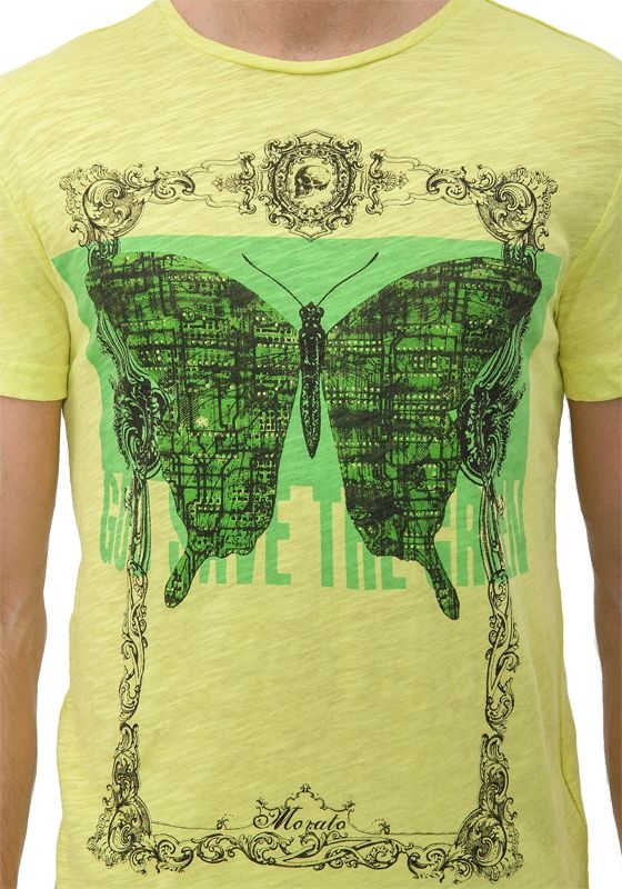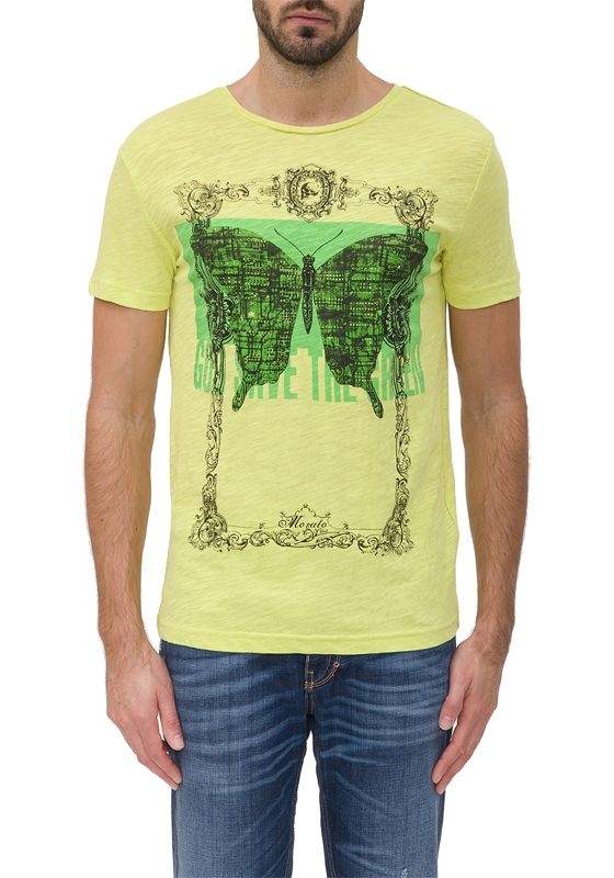 Geel t-shirt van Antony Morato met ronde hals. Het shirt is voorzien van een vlinder opdruk in de kleur groen. Hele mooie zomerkleuren dus!