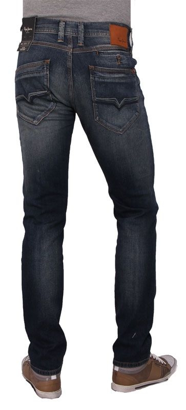 Donkerblauwe jeans van het kledingmerk Pepe jeans. Slim fit, low waist en slim leg. Een dubbele zak op de rechter achterkant. Eén hiervan is te sluiten met een knoop.