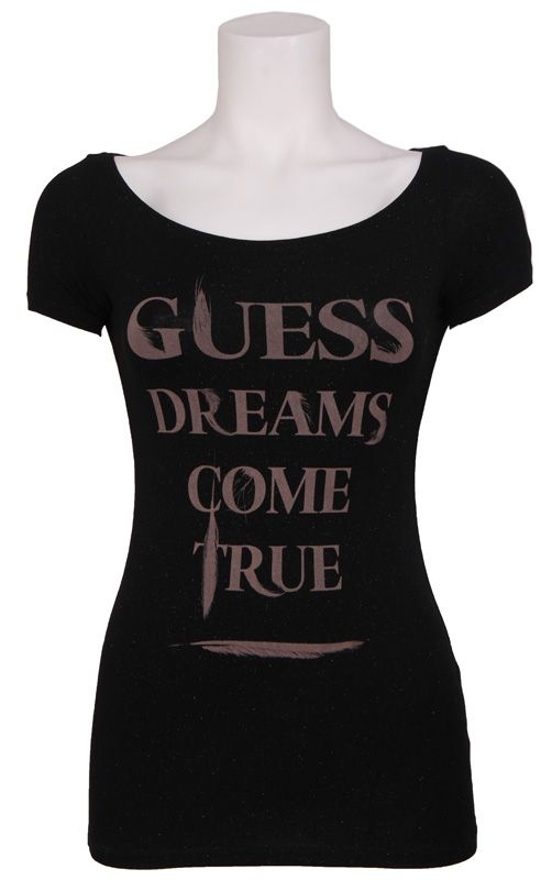 Logo shirt van Guess in de kleur zwart. Voorzien van de tekst 'Guess dreams come true' op de voorkant. Het shirt heeft een ronde hals en heeft een subtiele glitter in de stof waardoor het t-shirt nog een mooiere en luxere uitstraling krijgt.