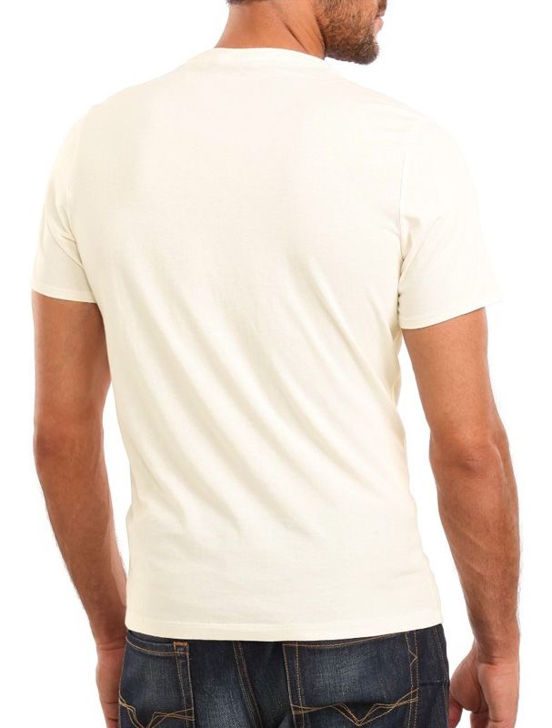 Crème t-shirt van Guess met duidelijk logo op de voorkant. Het shirt heeft een ondiepe v-hals en is dus goed aangesloten bij de nek.