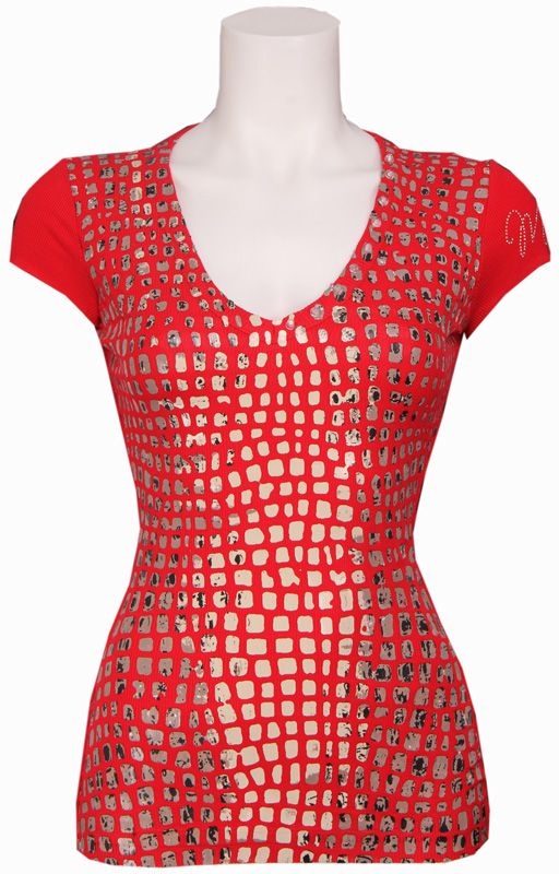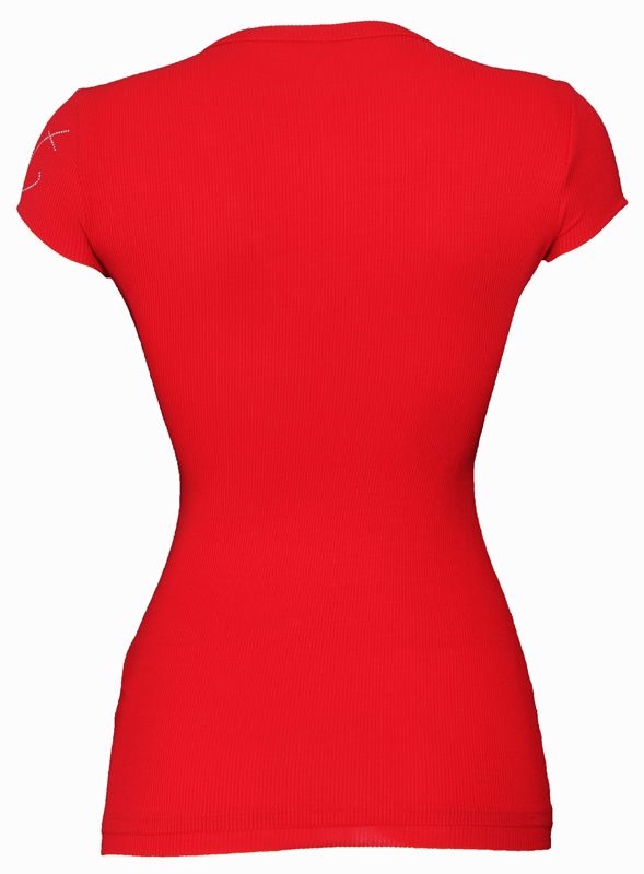 Rood shirt met v-hals van Met in Jeans. Het shirt valt mooi aansluitend en heeft verschillende opvallende details, waaronder zilveren MET letters op de arm en doorzichtige pailleten op de linkerkant van de v-hals.