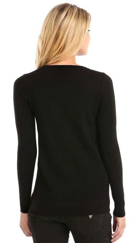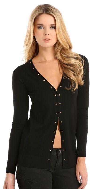 Zwart vest van Guess. Sluiting met haakjes. Over de hele boord voorzien van gouden studs. Met V-hals.