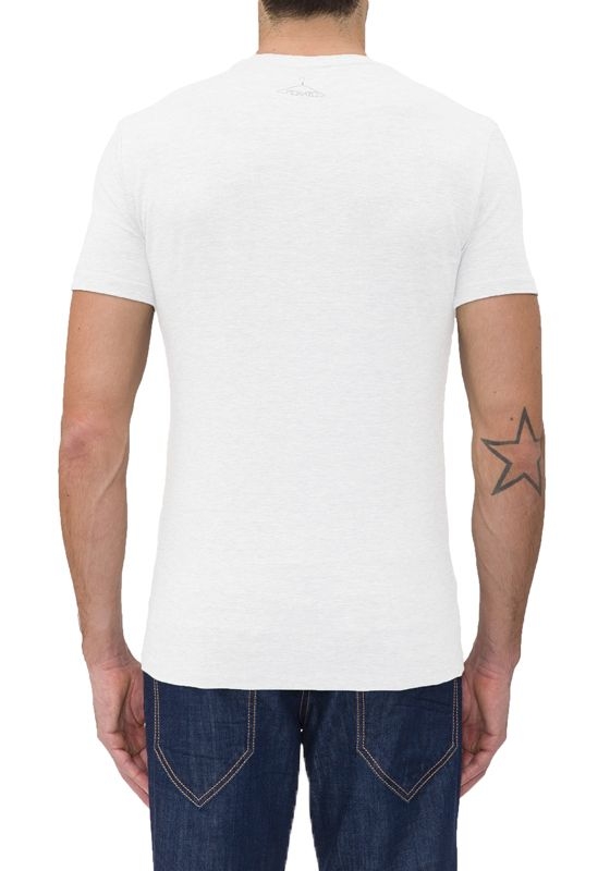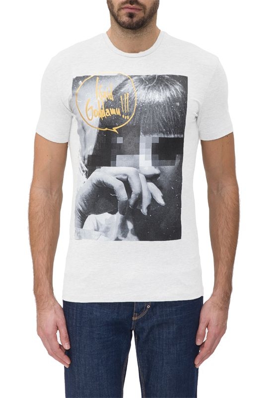 Wit t-shirt van Antony Morato met een ronde hals. De voorkant is voorzien van een plaatje van een vrouw in zwart/wit met daarop een gouden 'strip' look.