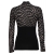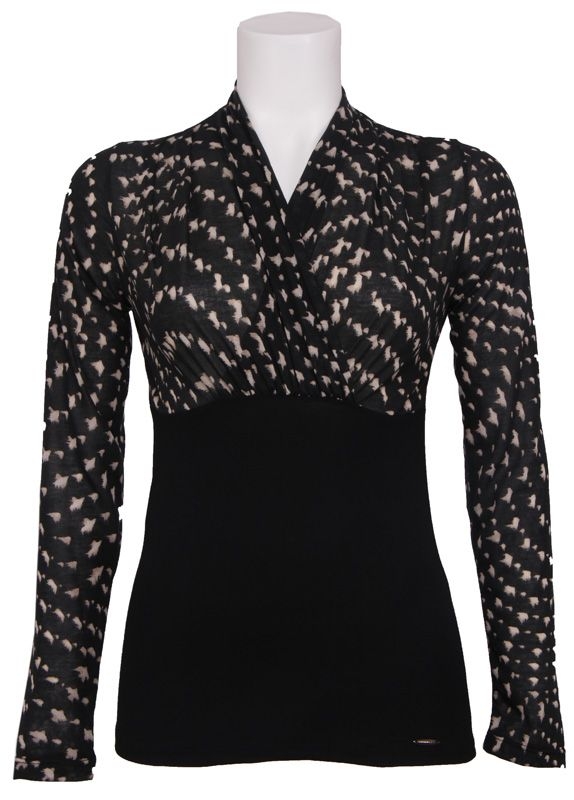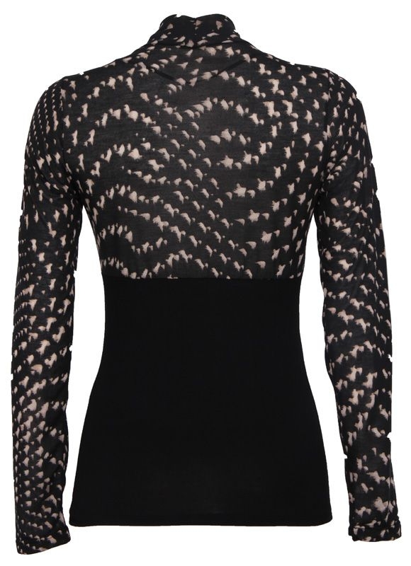 Zwart wit truitje van Amy Gee dat straks zit rond de taille. De bovenkant van het shirt bestaat uit doorzichtige stof in het zwart met witte 'wolkjes' en heeft een v-hals. Nadat het shirt strakker wordt bij de taille loopt het uit in helemaal zwart tot ongeveer te heupen.